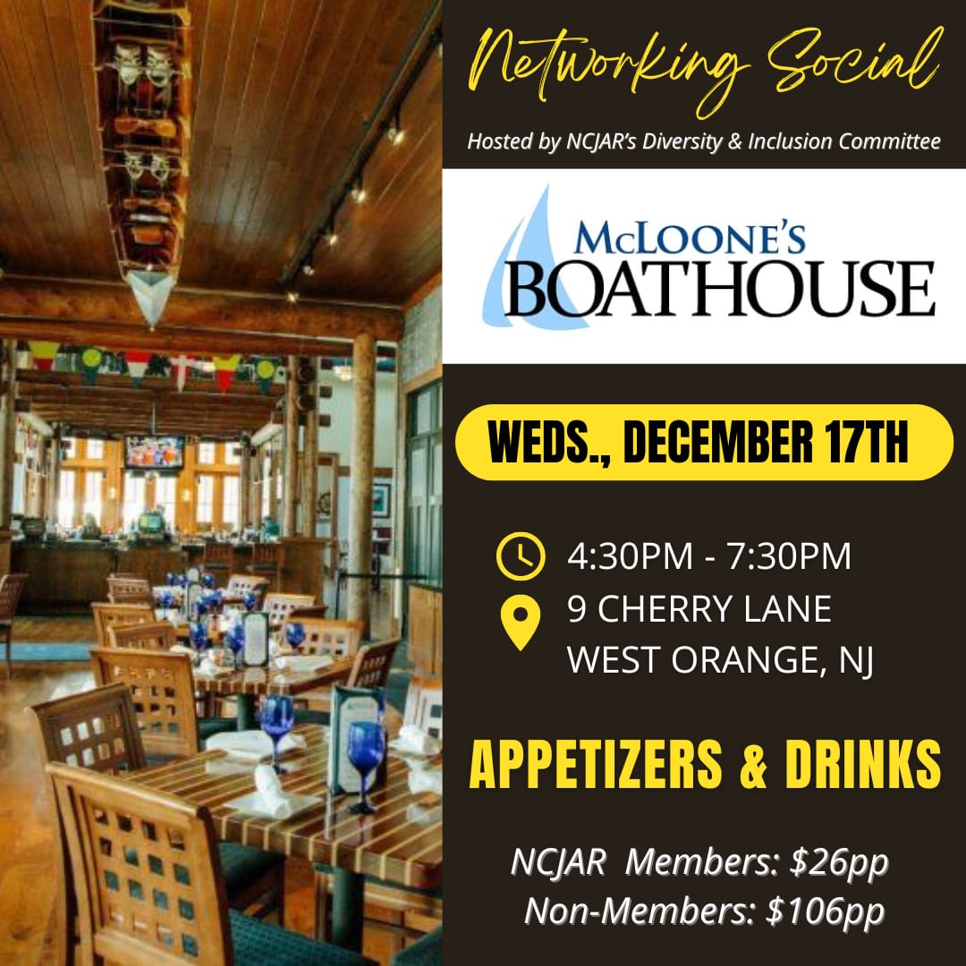 All are welcome to join NCJAR's Diversity & Inclusion Committee for a fun-filled holiday social at McLoone's Boathouse (9 Cherry Lane, West Orange, NJ 07052) on Wednesday, December 17th, from 4:30PM – 7:30PM!